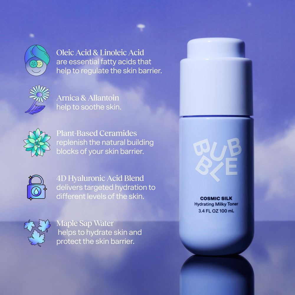 Meet the toner your skin has been waiting for – the Bubble Skincare Cosmic Silk Hydrating Milky Toner. This silky, lightweight formula replenishes hydration, balances your skin, and calms irritation without heaviness or residue. Packed with nourishing ingredients, it leaves skin soft, smooth, and radiant. Perfect for all skin types, even sensitive, this toner elevates your routine with a boost of moisture and care.